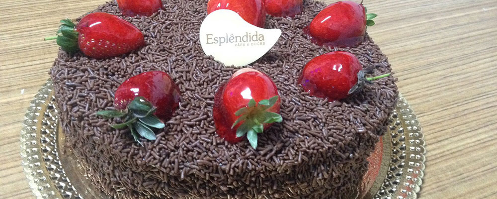 Ingredientes: pão-de-ló de chocolate, recheado com mousse de morango e morango picado, cobertura de mousse de morango e creme Paris**, decorado com morangos inteiros.